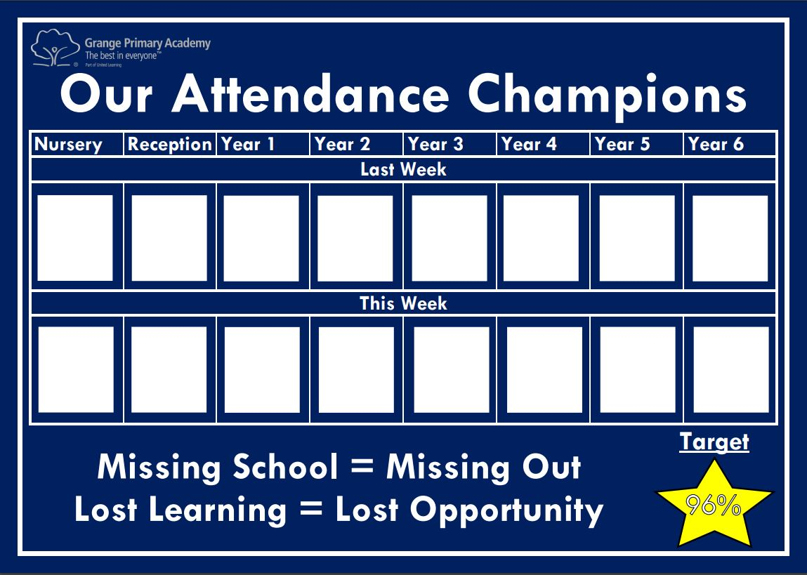 Here at Grange Primary Academy, we strive for every child to achieve 96% attendance or above.