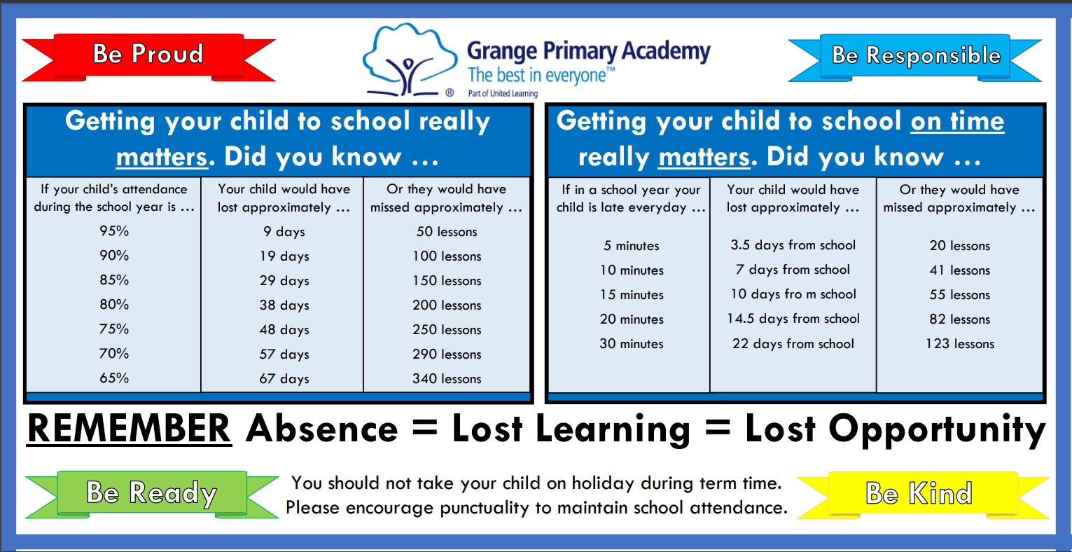 There is clear evidence that any absence from school can and will have an impact on a child's attainment. At Grange we have robust Attendance and Punctuality Strategies in place (attached documents below) to ensure that your child’s attendance and punctuality are the best they possibly can be.