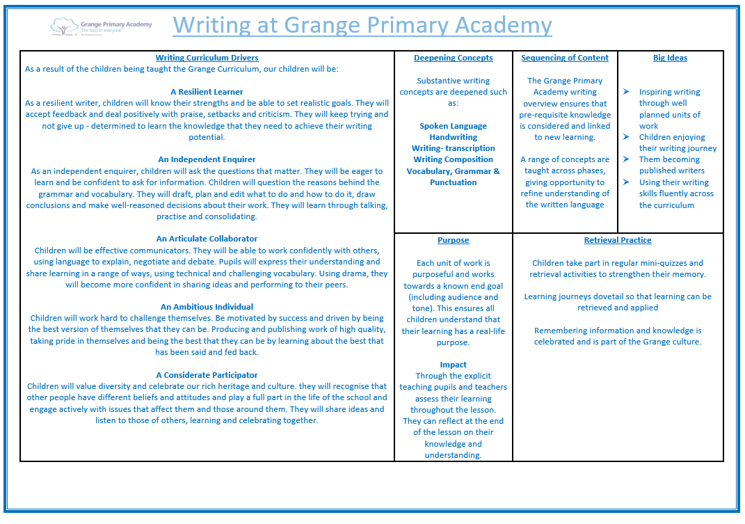 At Grange Primary Academy we have a bespoke writing journey from EYFS through to Year 6. Within this journey the children focus on poetry, fiction and non fiction in an engaging, creative and meaningful way. Children write for a known audience and devlop skills to write for different audiences with our older children also focusing upon the tone of their writing.